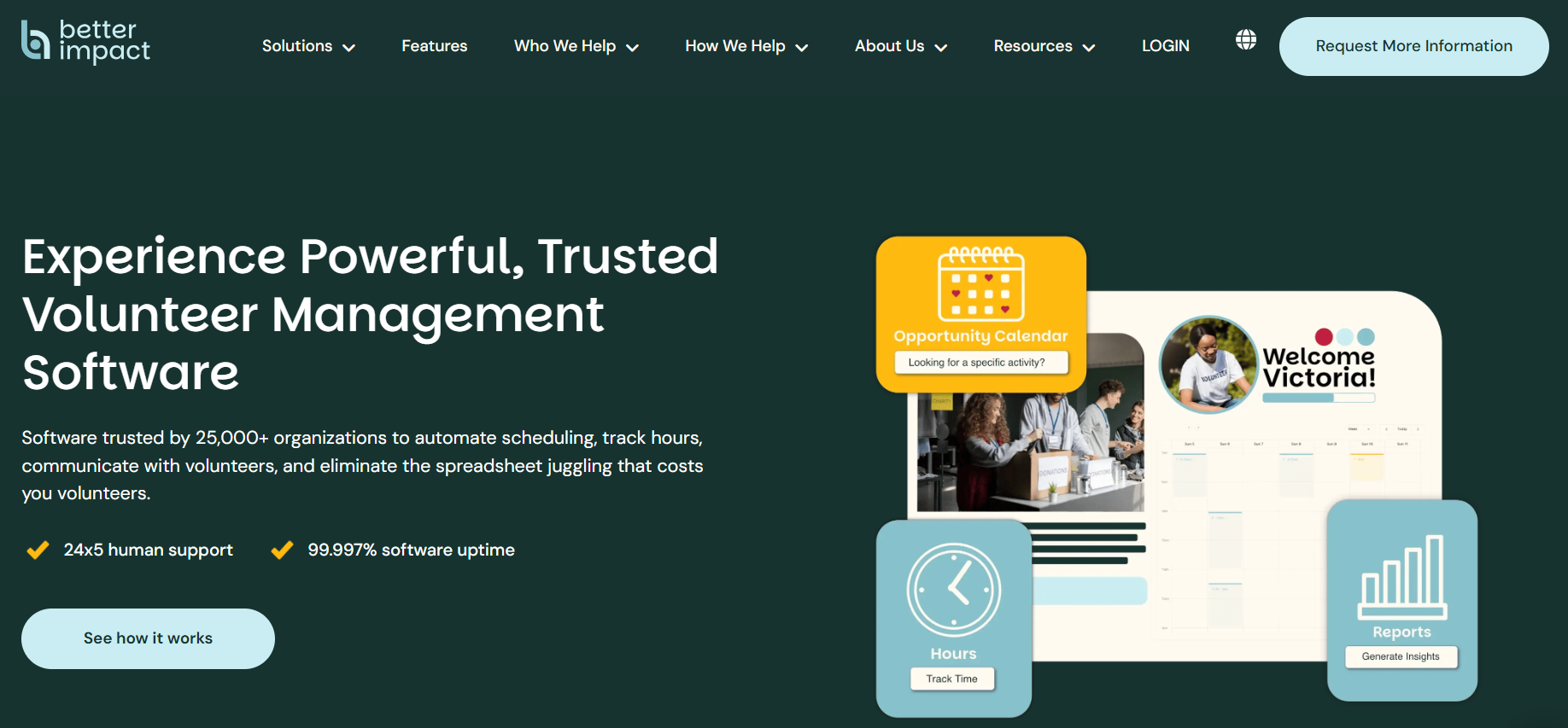 Better Impact’s “Volunteer Impact” system helps nonprofits engage volunteers, track activity, and generate customizable reports. It’s designed for organizations that need detailed and secure data management as well as a wide range of reporting templates.